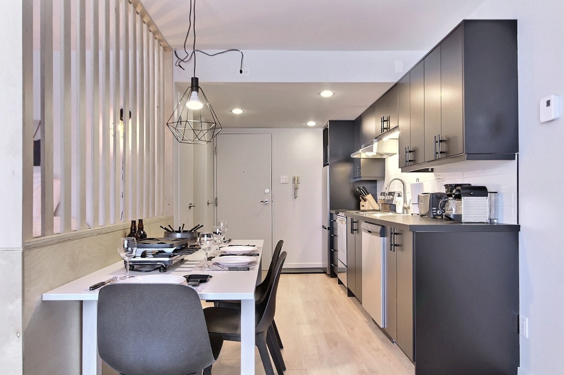 ✦ Il offre une cuisine entièrement équipée avec lave-vaisselle pour permettre de cuisiner lors du séjour. Ustensiles, vaisselle, chaudrons, poêles, plaques, etc. sont fournis afin de faciliter la tâche. De plus, il y a une table à manger avec 4 chaises pour déguster vos repas.