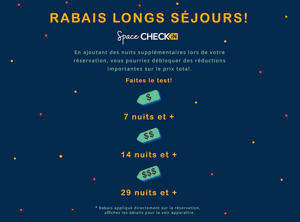 Veuillez nous écrire 24h avant votre arrivée pour faire une demande d'arrivée hâtive ou de départ tardif s'il-vous-plaît. Il nous fera plaisir d'accepter votre demande si l'horaire des équipes d'entretien le permet.