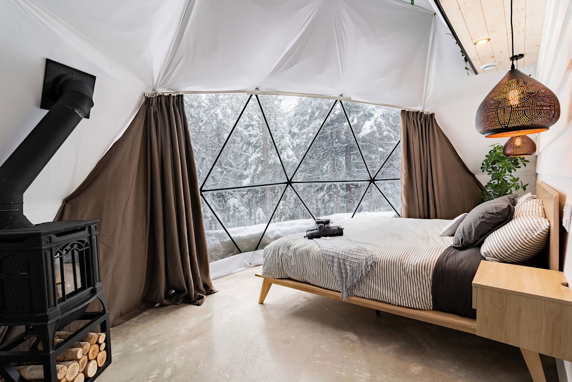 ✦ Les Dômes sont munis de planchers chauffants, d'un foyer à gaz électrique, ainsi qu'une thermopompe qui diffuse de la chaleur et de l'air climatisé en été.