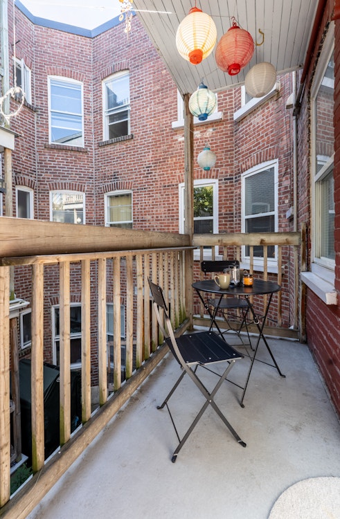 Savourez un petit balcon privé, équipé d'une table et de deux chaises : l'endroit idéal pour déguster votre café du matin. Veuillez noter qu'il est également relié à l'escalier arrière du logement, il n'est pas impossible d'y croiser nos voisins de l'appartement du dessus.