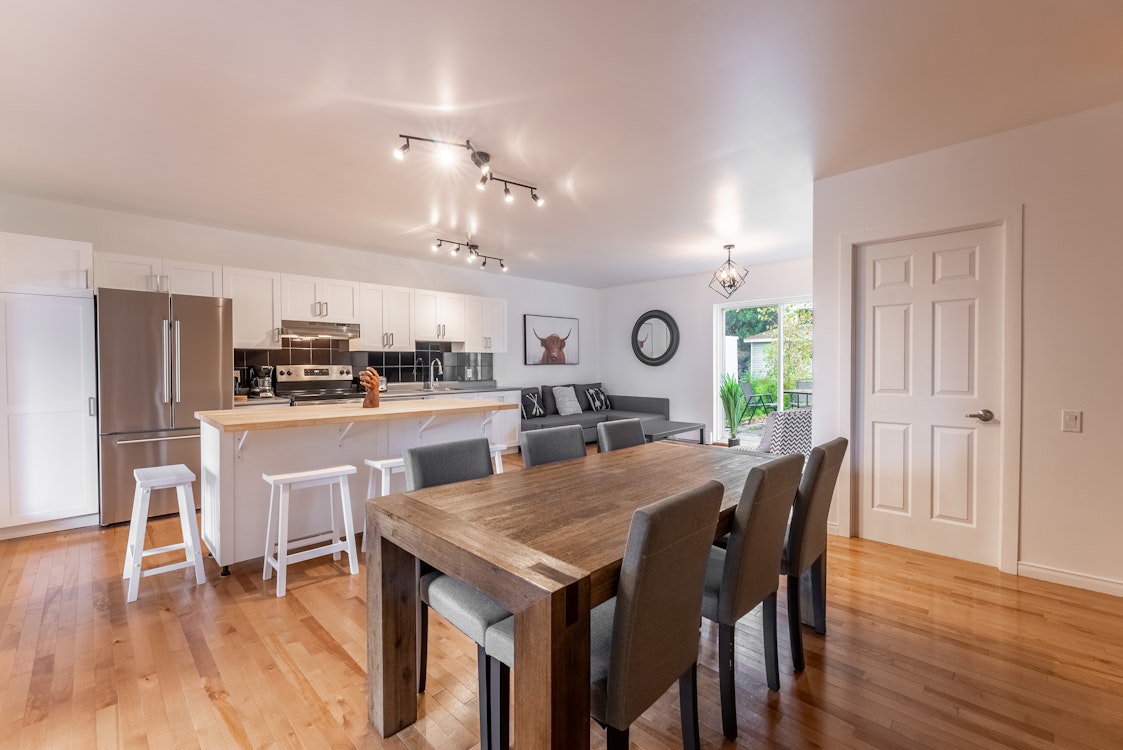 ✦ Une grande cuisine toute équipée pour vous permettre de cuisiner de bons plats pendant vos vacances. Vaisselle, ustensiles, verres, plats, chaudrons, poêles, cafetière et essentiels alimentaires sont sur place pour faciliter la préparation. Vous aurez même accès à un kit de fondue, un kit à raclette, un grille-pain et une mijoteuse!