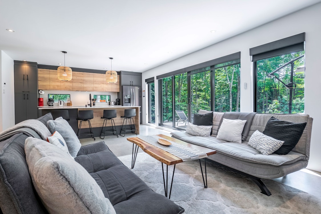 ✦ Au salon on retrouve deux grands divans qui peuvent se transformer en lit double le soir, une télévision intelligente permettant d'accéder à votre compte Netflix et un chaleureux foyer au gaz pour vous réchauffer durant l’hiver.