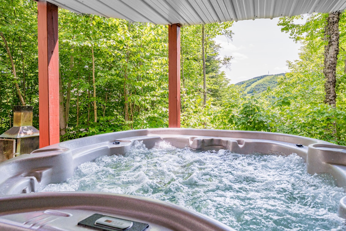 ✦En sortant sur le patio du Rez-de-Jardin, vous trouverez le Spa luxueux accessible en tout temps, avec une belle vue sur les montagnes, juste à côté du foyer extérieur avec des chaises longues pour vous prélasser.