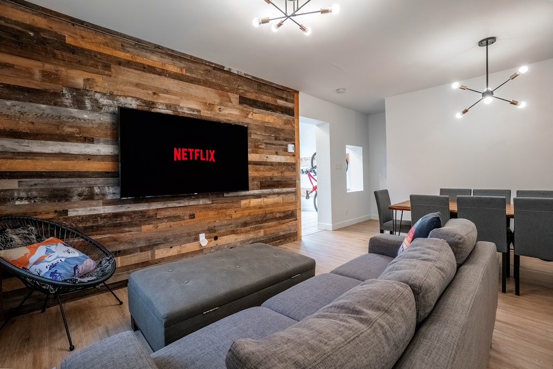 ✦ Au salon on retrouve un grand divan, une chaise d'accent et une télévision intelligente permettant d'accéder à votre compte Netflix, Chromecast et Apple TV.