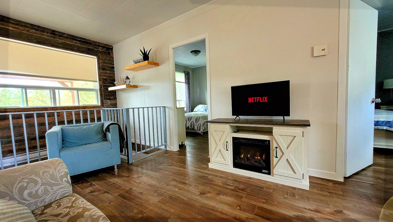 ✦ Un salon avec télévision intelligente. Cette dernière vous permettra de vous connecter directement à vos compte Netflix, Prime Vidéo et Disney. Vous y apprécierez le foyer électrique encastré dans un beau meuble de style Farmhouse !