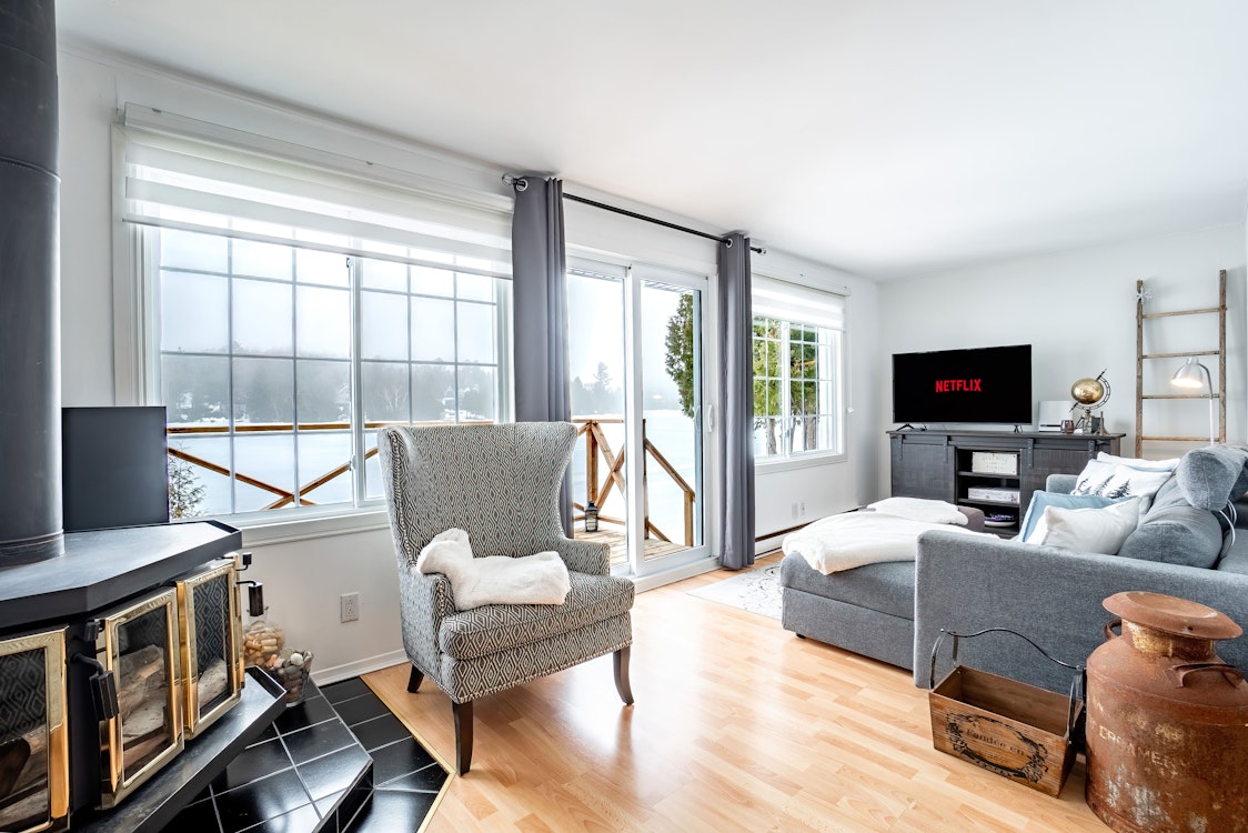 Au rez-de-chaussée, vous trouverez également la salle à manger avec une grande table pour 6 personnes, le salon avec TV intelligente et canapé confortable pour vous prélasser en toute quiétude, une salle de bain avec lavabo, toilette et douche ainsi que deux chambres fermées, aménagées avec goût et équipées de lits Queen, rideaux occultants et garde-robe/commodes pour entreposer vos vêtements. Il y a aussi un patio avec barbecue pour vos grillades face au lac.