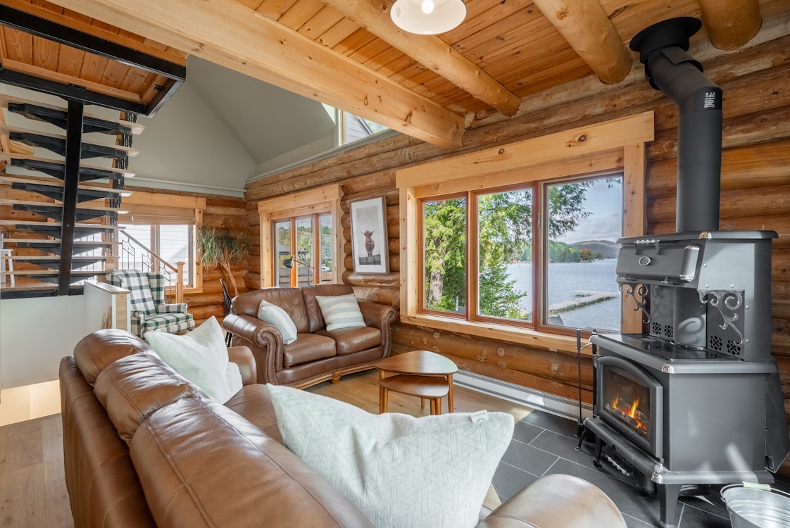 Chaleureux et accueillant, notre salon dispose de divans confortables, d'un poêle au bois et de grandes fenêtres offrant une vue spectaculaire sur le lac.
