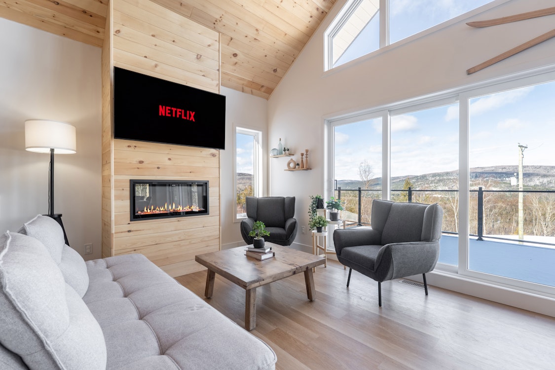 Le salon principal dispose d'un foyer électrique, un coin parfait pour la lecture et une télévision intelligente pour diffuser vos émissions préférées. La lumière naturelle y est abondante, créant une atmosphère chaleureuse et accueillante tout au long de la journée.